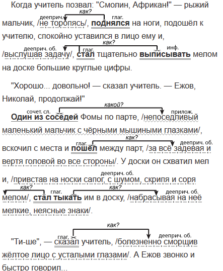 В отличие от Смолина, один из соседей Фомы по парте — /непоседливый маленький мальчик с чёрными мышиными глазками/ (приложение, стоит после имени сущ., выражено словосочетанием), вскочил с места и пошёл между парт, // (дееприч. об.). В данном случае приложение помогает более конкретно охарактеризовать Ежова, добавляя детали о его внешности и поведении.